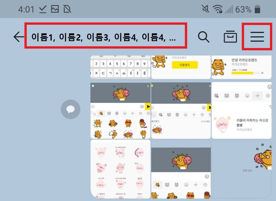 흔한 단톡방의 모습입니다. 채팅방 상단에는 단톡방 참여자들의 이름이 쭉 나열되어 있습니다. 단톡방이 여러개가 되다보면 어떤 방이 어떤 모임인지 구분하기 어려운 경우가 많습니다. 따라서 오늘은 각 단톡방의 이름을 변경해 보겠습니다.