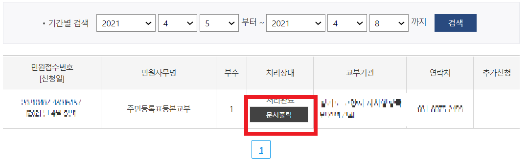 민원함에서 처리상태를 확인 후 문서 출력을 선택합니다.