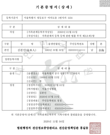개인정보인 이름과 주민등록번호가 기본으로 나와있으며, 현재 주거하고 있는 거주지나 등록기준지 확인이 가능합니다. 자신의 변동된 사항을 증명하기 위한 서류로 이용합니다. 예를들어 국적이 변경되었거나 개명을 한 경우 그 내용이 함께 나와있기 때문입니다.
