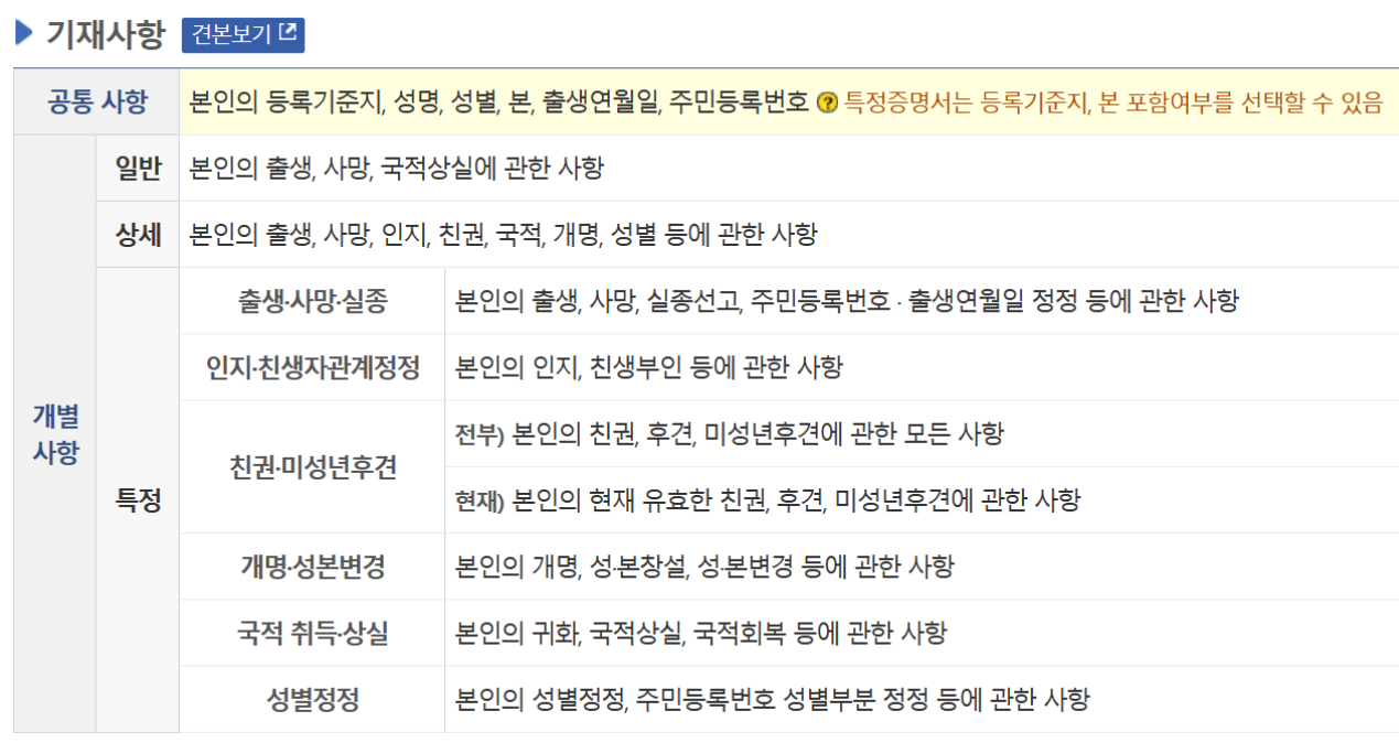 하지만 일반은 본인의 출생, 사망, 국적상실 등에 관한 사항을 확인할 수 있는 반면 상세는 일반 사실에 더하여 인지, 친권, 국적, 개명, 성별 등에 관련된 내용도 더 자세히 나옵니다. 또한 특정의 경우 출생이나 사망, 실종에 관한 내용, 인지와 친생자 관계 정정 부분, 친권 및 미성년 후견 내용, 개명을 하거나 성본을 변경한 사실, 국적 취득과 상실 내용, 성별이나 주민등록번호 성별부분 정정 등이 나와있습니다.