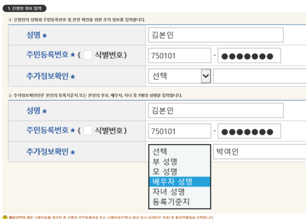 자신의 이름과 주민등록번호를 입력하면 되고, 대리신청을 할 경우에는 대리인 정보도 함께 입력합니다.