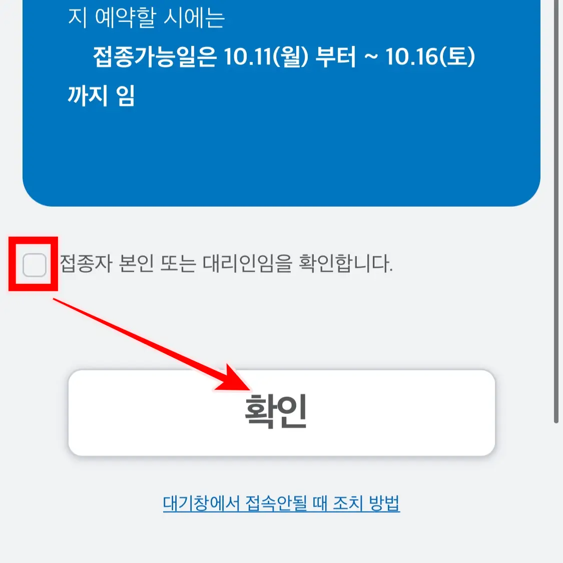 접종자 본인 또는 대리인임을 체크한 후 확인을 합니다.