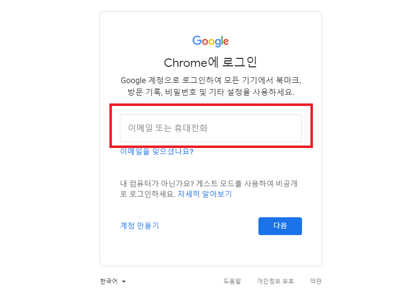 구글 크롬 로그인 화면이 나옵니다. 기존에 사용하던 이메일 주소와 비밀번호를 입력합니다.