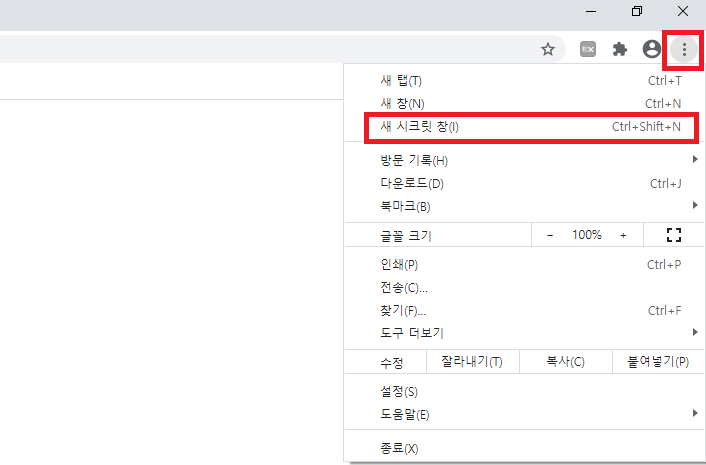 구글 크롬 브라우저를 실행합니다. 오른쪽 상단에 보면 더보기 메뉴인 점 세개가 있습니다. 해당 부분을 클릭하면 구글 크롬 메뉴가 나옵니다. 구글 크롬 시크릿모드 설정을 위해서는 세번째 항목인 '새 시크릿 창'을 선택해줍니다. 또는 단축키를 이용하려면, 구글 크롬창을 켠 상태에서 'Ctrl+Shift+N'을 눌러줍니다.