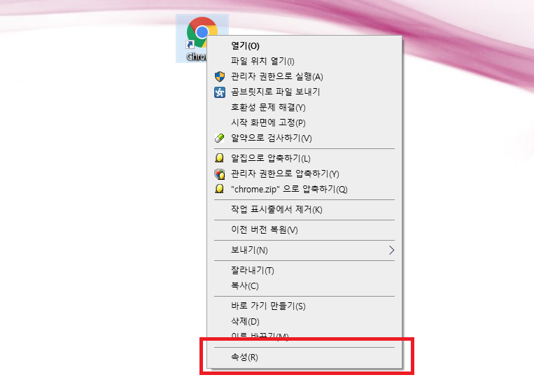바탕화면의 구글 크롬 아이콘을 선택하고 마우스 오른쪽 버튼을 눌러줍니다. 메뉴가 나오는데, 가장 마지막 항목인 속성을 선택해주시기 바랍니다.