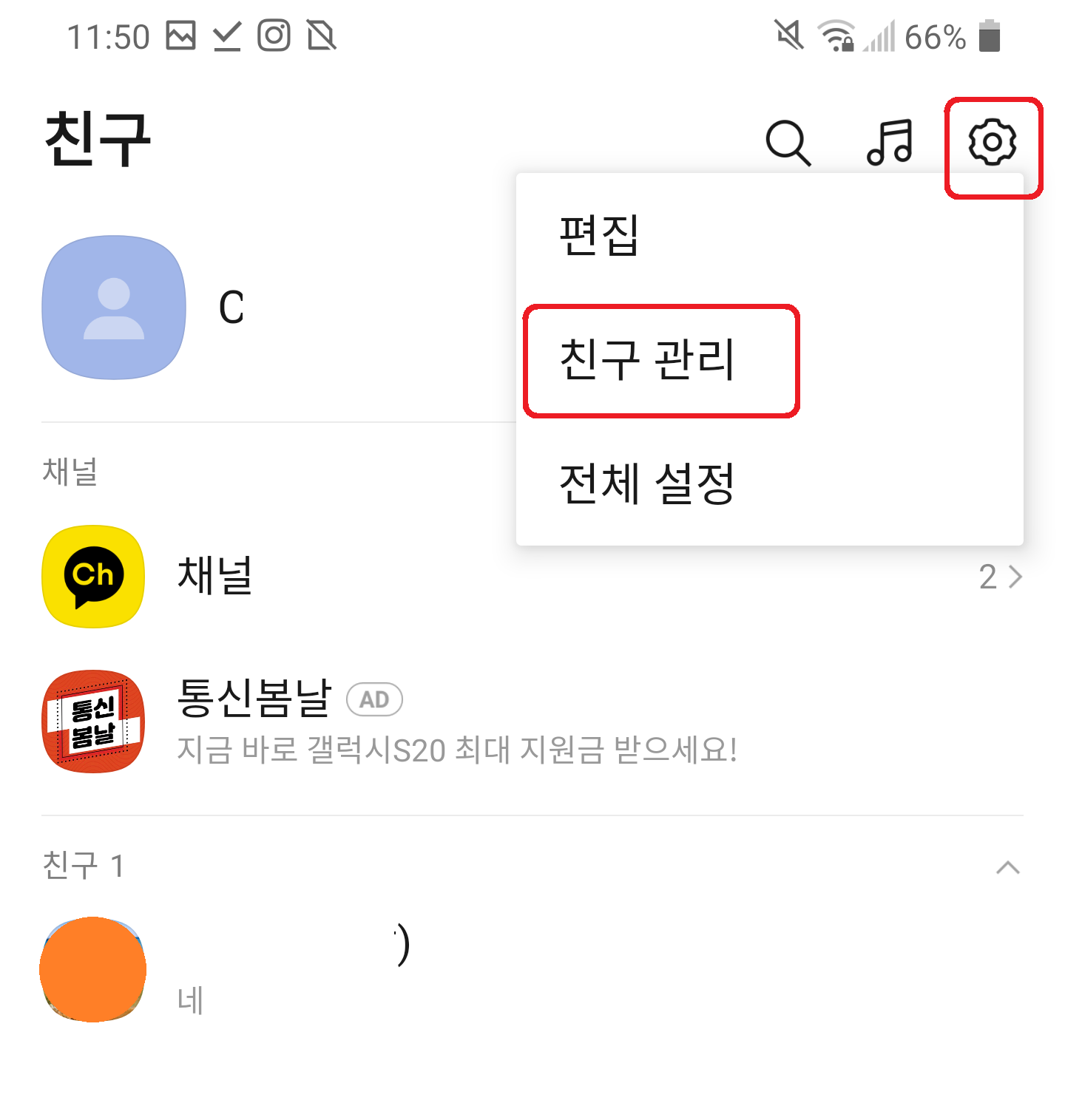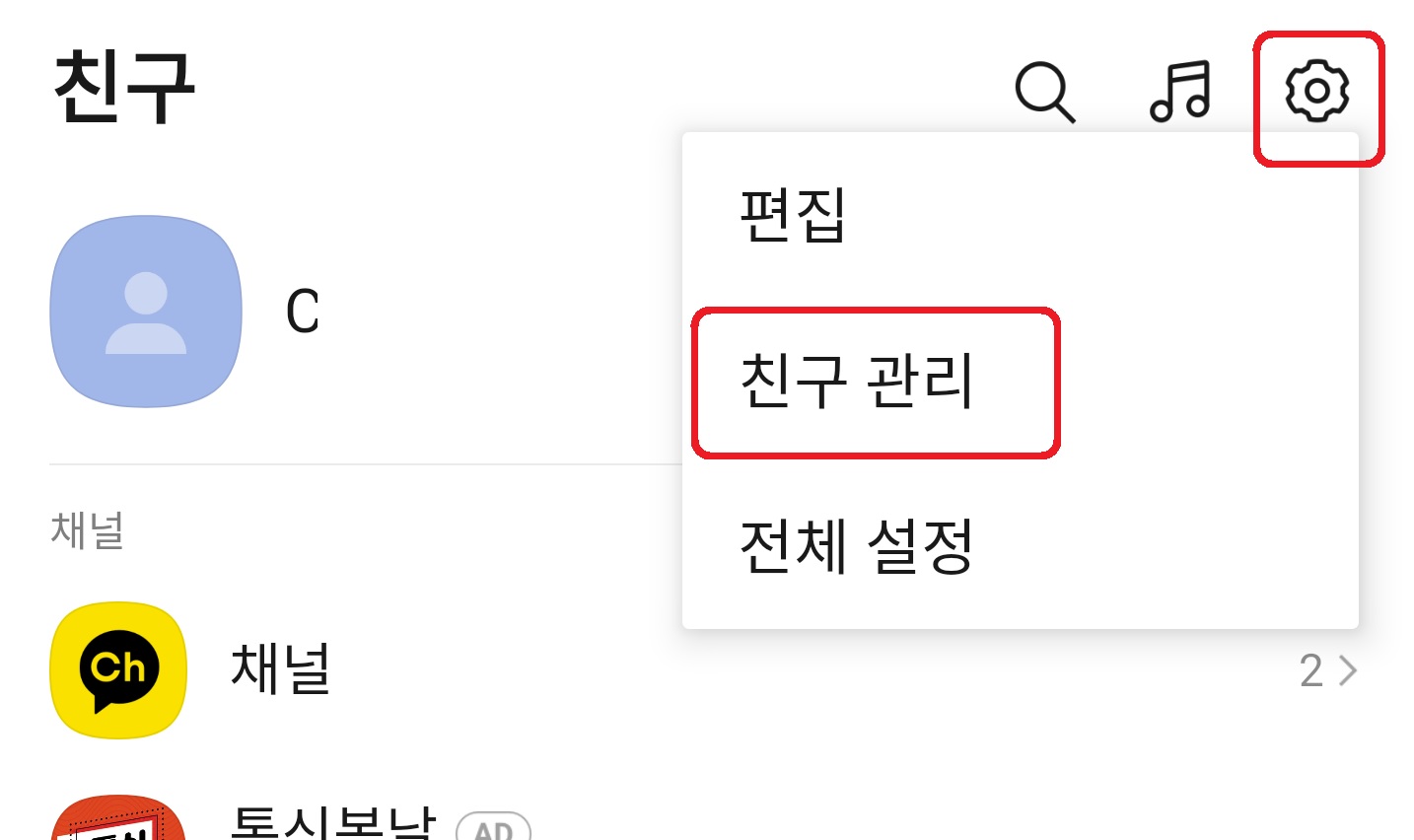 카카오톡 메인 화면에서 오른쪽 위에 톱니바퀴를 눌러줍니데. 그럼 메뉴가 나오는데, 가운데 '친구 관리'를 눌러주시기 바랍니다.