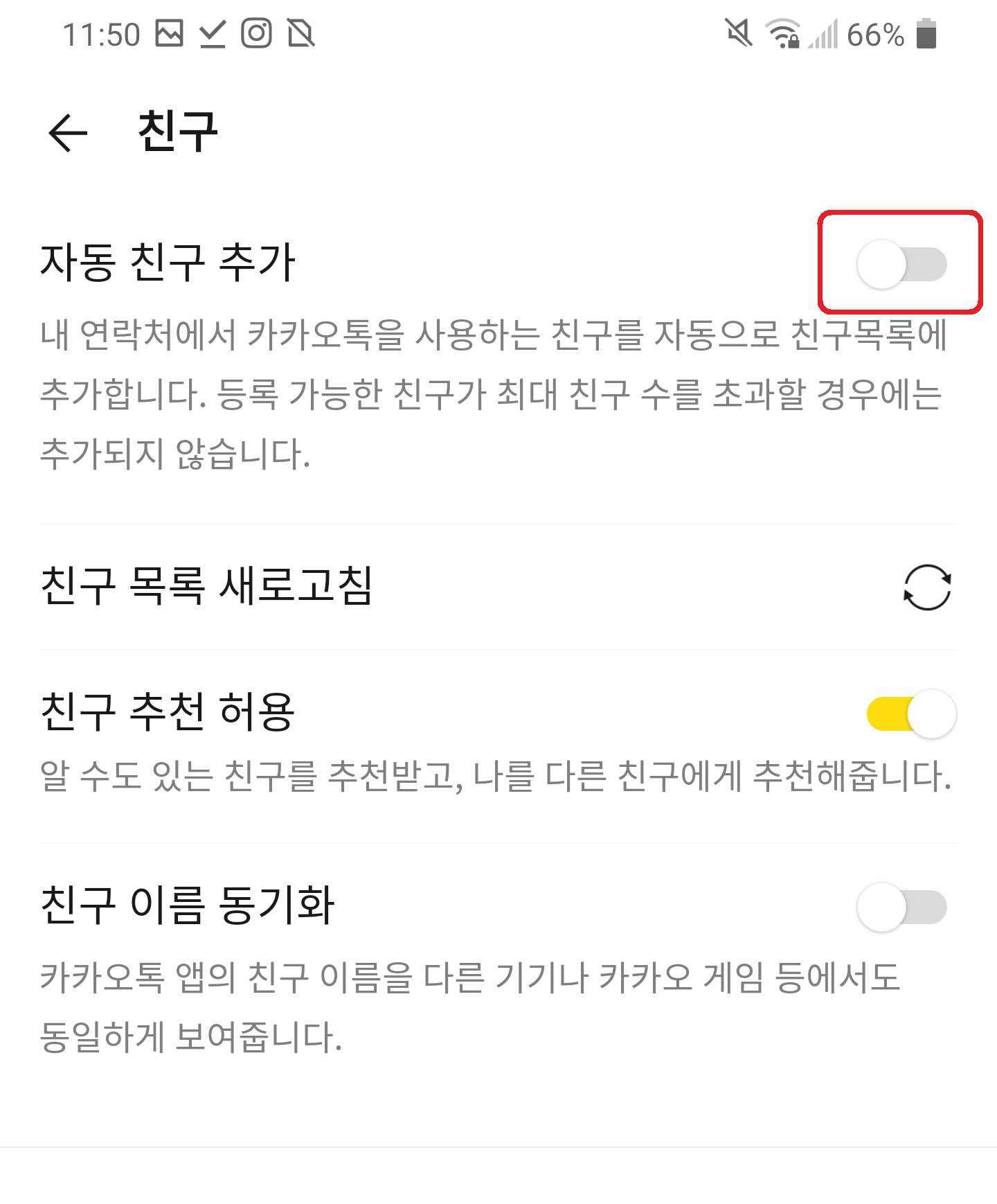 친구 추천 허용은 등록 되지 않는 친구를 추천해주거나, 나를 다른 사람에게 추천해줍니다. 내가 아는 지인들과만 카카오톡을 사용하길 원한다면 이 부분을 꺼주시기 바랍니다.