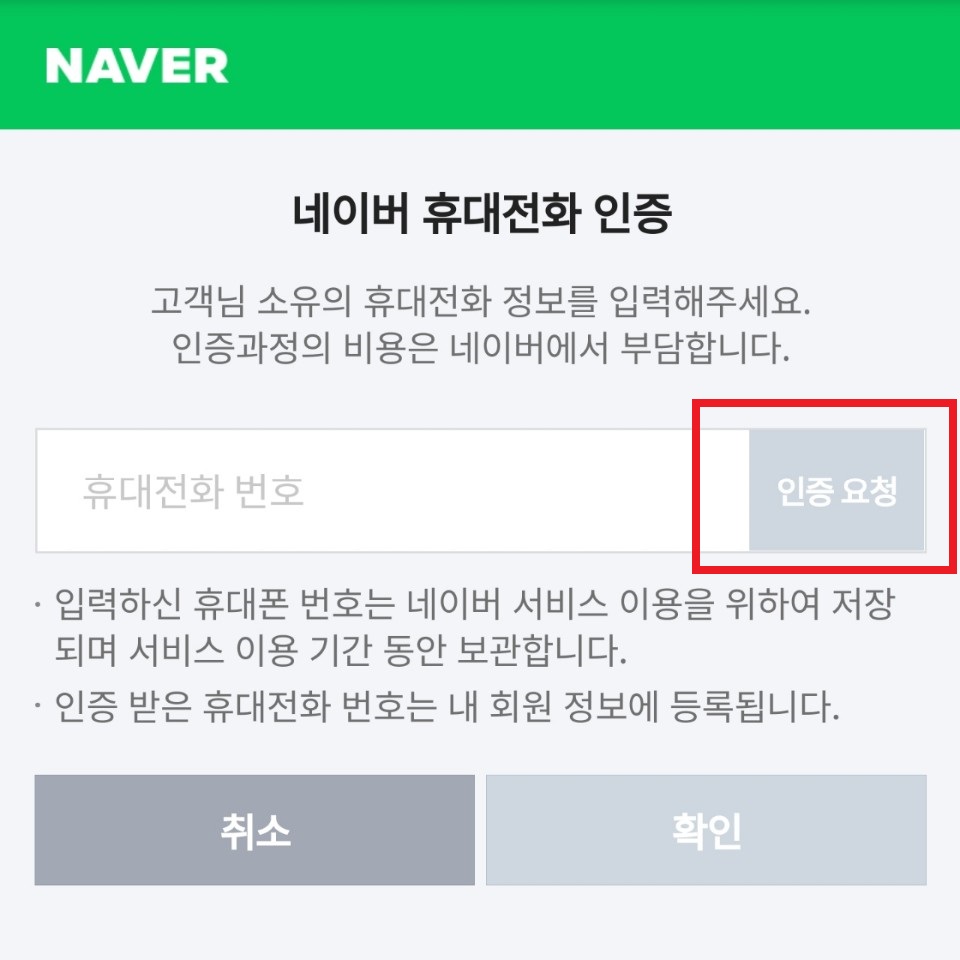 본인의 휴대폰 번호 입력 후 인증요청을 누르면 바로 휴대폰으로 문자가 발송됩니다. 문자에 나와있는 인증번호 숫자를 입력한 후 화면 하단의 확인을 합니다.