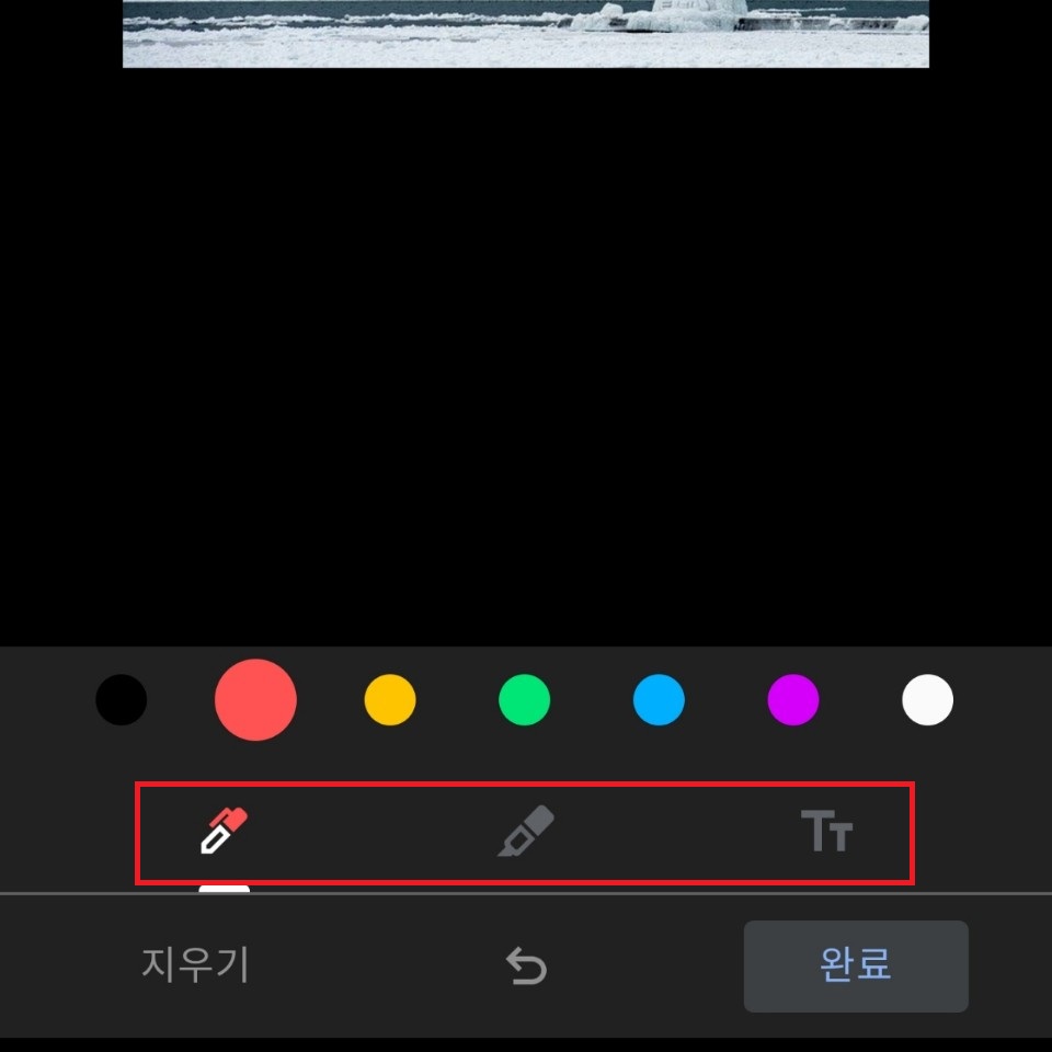 갤러리 > 더보기 > 마크업으로 들어가면 사진에 글씨 넣기 방법이 3가지가 있습니다. 펜, 형광펜, 텍스트 방식입니다. 색상은 크게 7가지 중에서 선택할 수 있습니다. 사진에 글씨 넣는 어플이 아니고 기본 제공되는 기능이므로 다양한 색상을 선택할 수 없음은 조금 아쉽습니다.