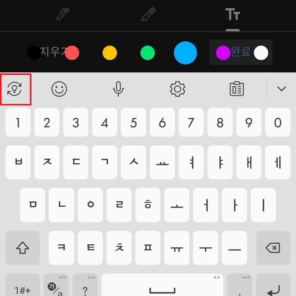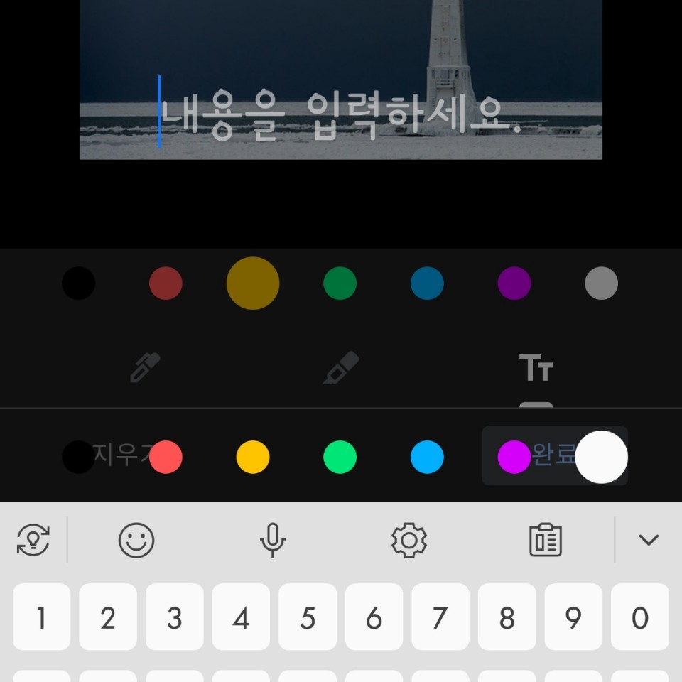 글씨 크기 조정이 쉽지 않은 손글씨보다는 사진에 글씨 넣기에 좋은 것은 텍스트 입니다. Tt를 선택하면 화면 하단에 키보드가 나타납니다. 원하는 색상을 선택한 후 사진에 글씨 넣기를 해줍니다. 해당 텍스트를 꾸욱 누른 후 위치도 변경할 수 있습니다.