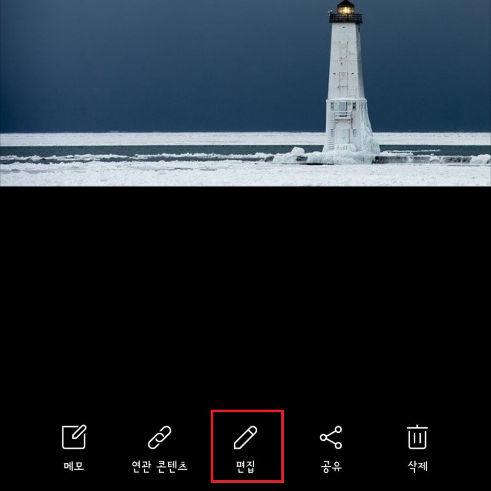 갤러리로 들어가 편집하고자 하는 사진을 불러옵니다. 사진 하단에 메뉴들이 나오는데 '편집'을 선택합니다. 편집으로 들어가면 핸드폰 기종에 따라 하위 메뉴는 다를 수 있습니다.