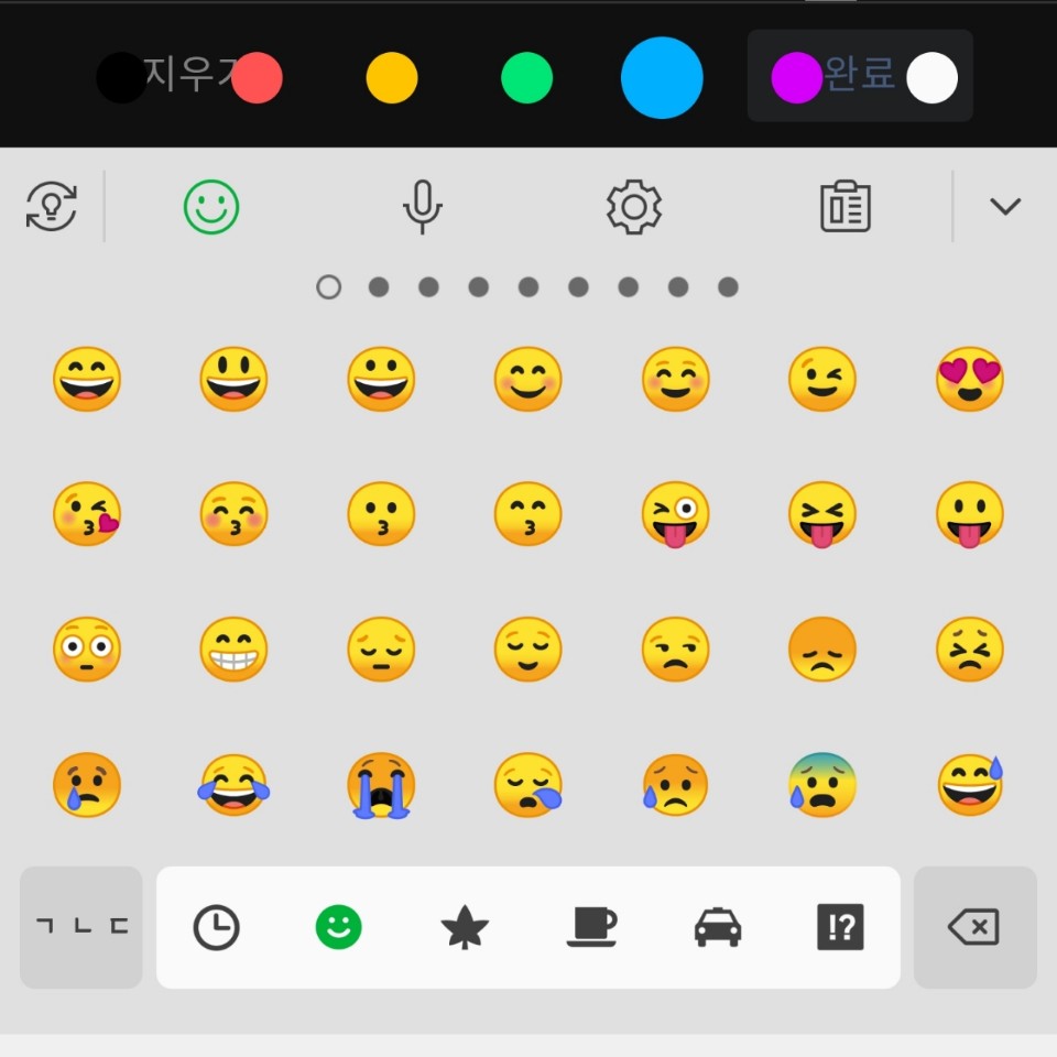 키보드 상단 왼쪽의 변환을 누르면 키보드가 이모티콘으로 바뀌게 됩니다. 휴대폰에서 기본으로 제공하는 다양한 이모티콘을 사진에 글씨 넣기 방법으로 동일하게 입력하실 수 있습니다.