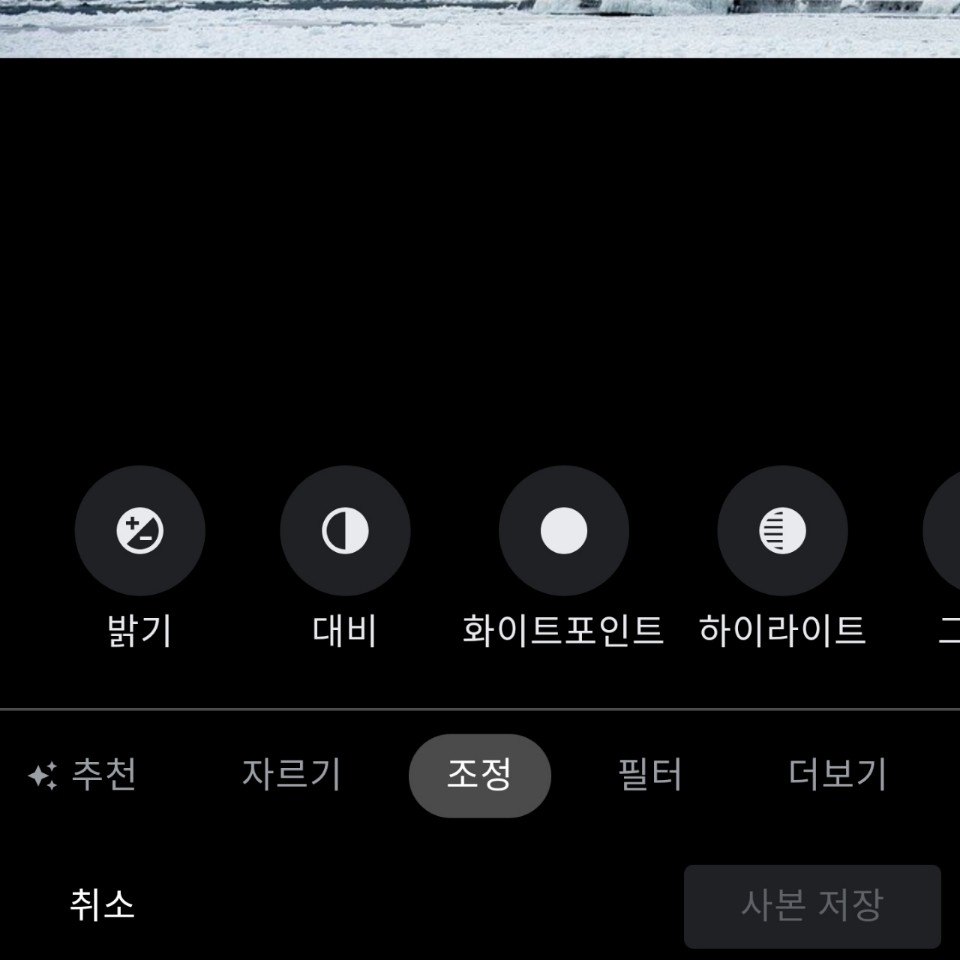 저 같은 경우는 추천, 자르기, 조정, 필터, 더보기의 메뉴가 있습니다. 자르기는 사진의 크기를 조정할 수 있는 편집 방법입니다. 조정은 사진의 밝기를 조절하는 것이므로 사진에 글씨 넣기와는 관계가 없습니다. 필터 역시 사진에 다양한 색감 조절을 통해 느낌을 바꿔주는 편집 방법입니다.