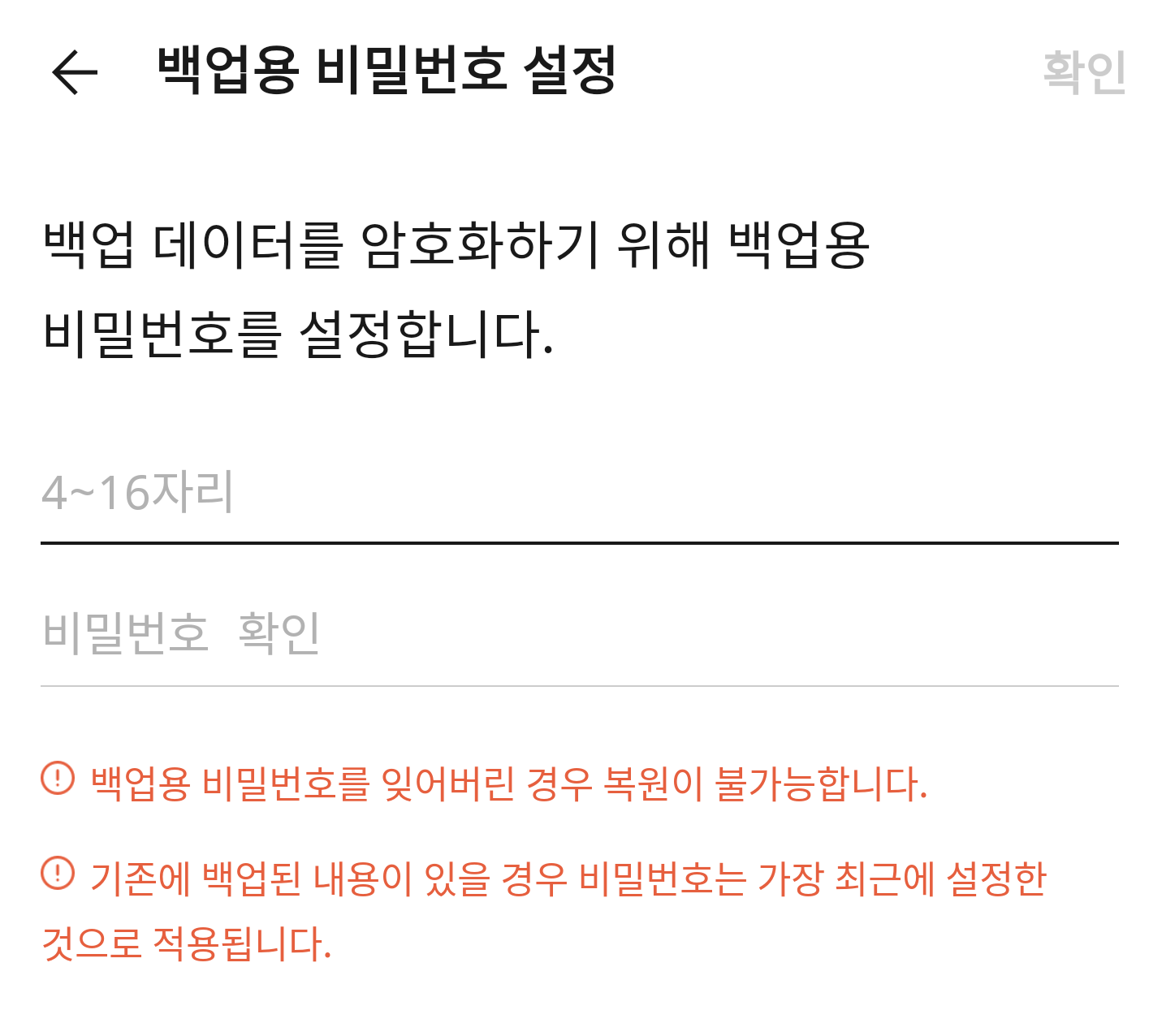 백업하기를 누르면 백업용 비밀번호 설정화면이 나옵니다. 아무나 내 카카오톡 대화내용에 접근하면 안되기 떄문에 비밀번호를 설정해줍니다. 어렵게 하면 추후 잊어버려 복원이 어려울 수 있습니다.