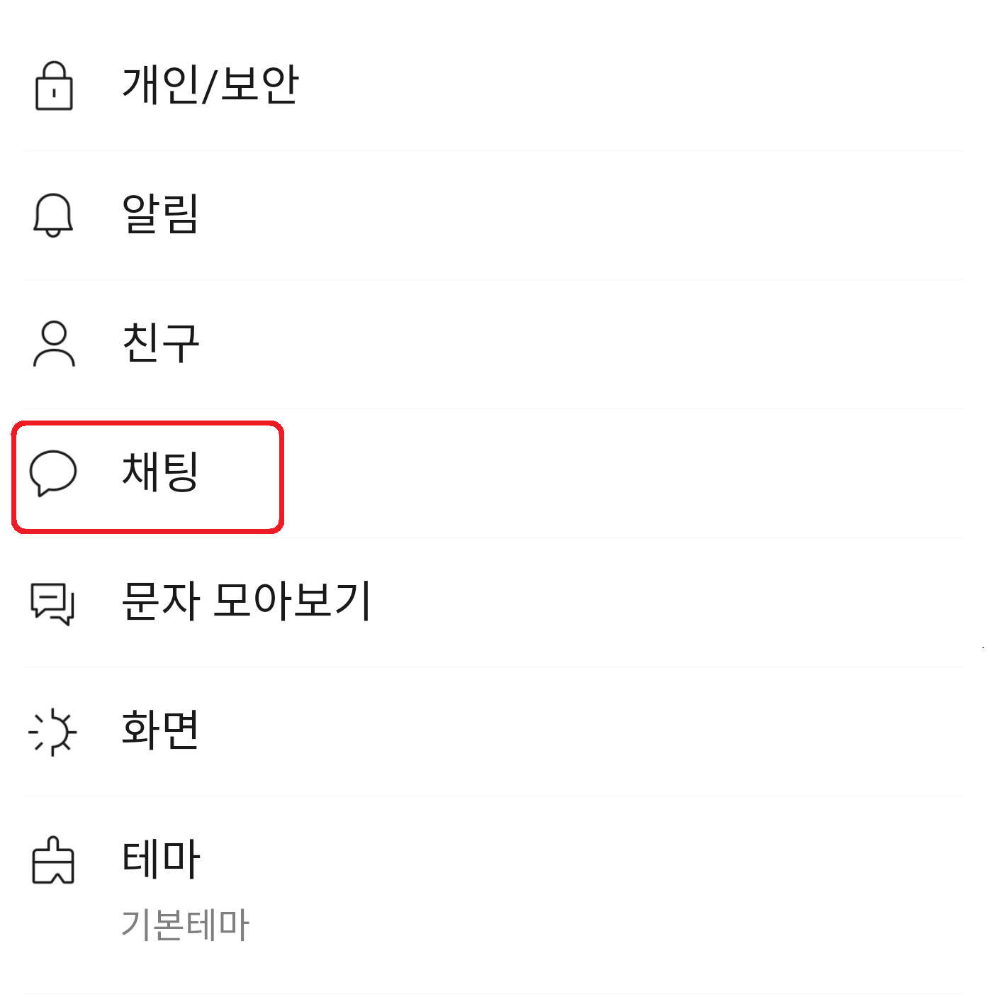 설정 화면의 많은 항목들 중 오늘 우리가 봐야할 부분은 '채팅'입니다. 이 부분은 설정 화면 중간 부분에 있습니다. 해당 항목을 선택해주시기 바랍니다.