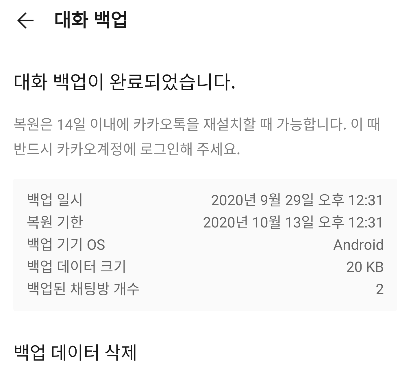 대화 내용이 많은 경우에는 카카오톡 대화 백업 시간이 조금 걸릴 수 있습니다. 백업이 완료되면 대화 내용 백업 날짜와 복원 기한이 나옵니다. 복원은 14일 이내에 할 수 있다고 공지되어 있습니다. 즉 14일이 지나면 해당 대화 백업 파일은 사용할 수 없습니다.