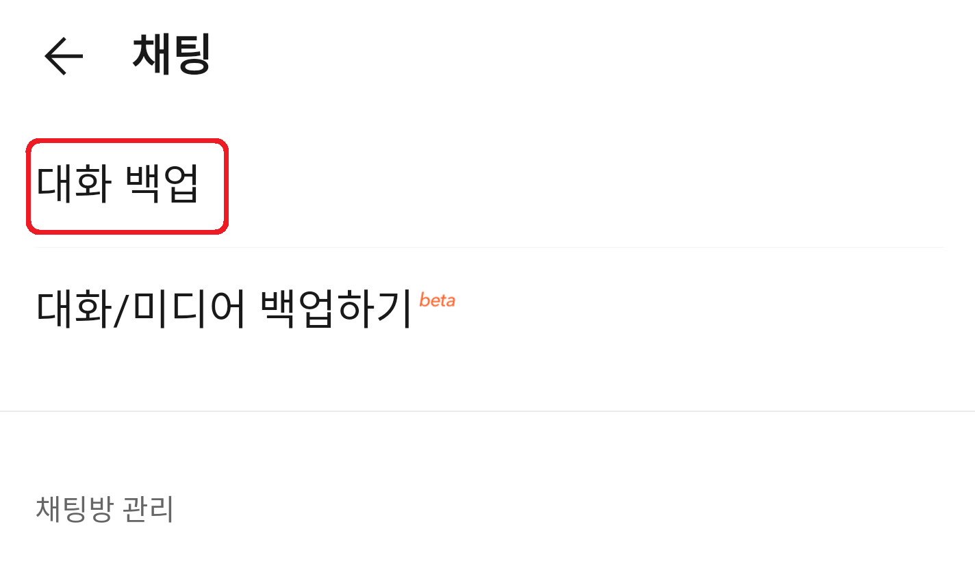 채팅 항목에 들어오니 가장 상단에 '대화 백업'과 대화/미디어 백업하기가 있습니다. 우리는 대화 백업을 통해 그동안 사용하던 카카오톡의 모든 대화내용들을 백업해볼 예정입니다. 대화 백업을 선택해주시기 바랍니다.