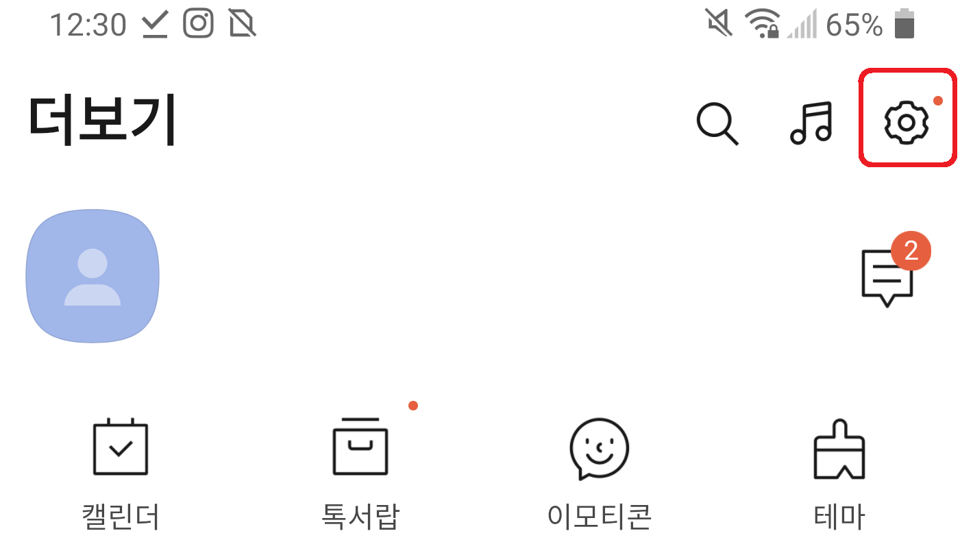 더보기 화면 위쪽에 보면 톱니바퀴 모양이 있습니다. 이부분을 선택하면 설정 화면으로 넘어가게 됩니다. 카카오톡 대화 내용 백업을 위해서는 설정 화면으로 가야 합니다.