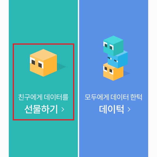 보내고자 하는 데이터양을 선택한 후 선물하기를 누르면 핸드폰 데이터 선물하기 어플 Y박스를 통해 데이터 나눔이 가능합니다.