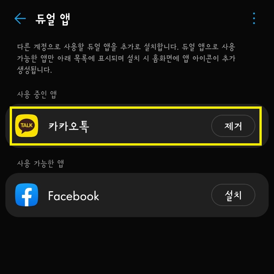 현재 듀얼앱이 가능한 어플은 카카오톡와 페이스북만 있습니다. 본인의 핸드폰에 설치된 어플 중 듀얼앱 기능을 제공하는 어플만 화면에 나오니, 사용자의 핸드폰에 따라 나타나는 목록은 다를 수 있겠습니다.
