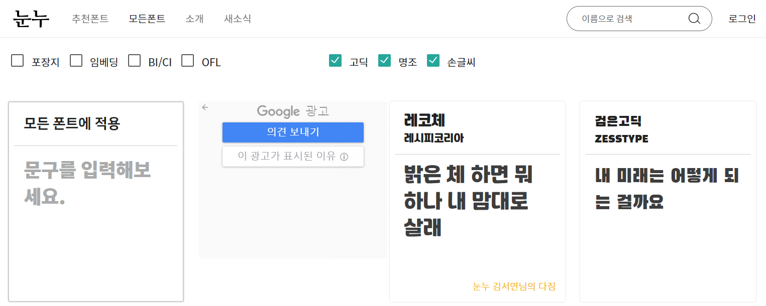눈누는 상업적 이용이 가능한 한글 폰트를 무료로 제공해주는 사이트입니다. 엄밀히 말하면 자유롭게 이용이 가능한 한글 무료 폰트들을 모아놓은 사이트라고 할 수 있습니다.