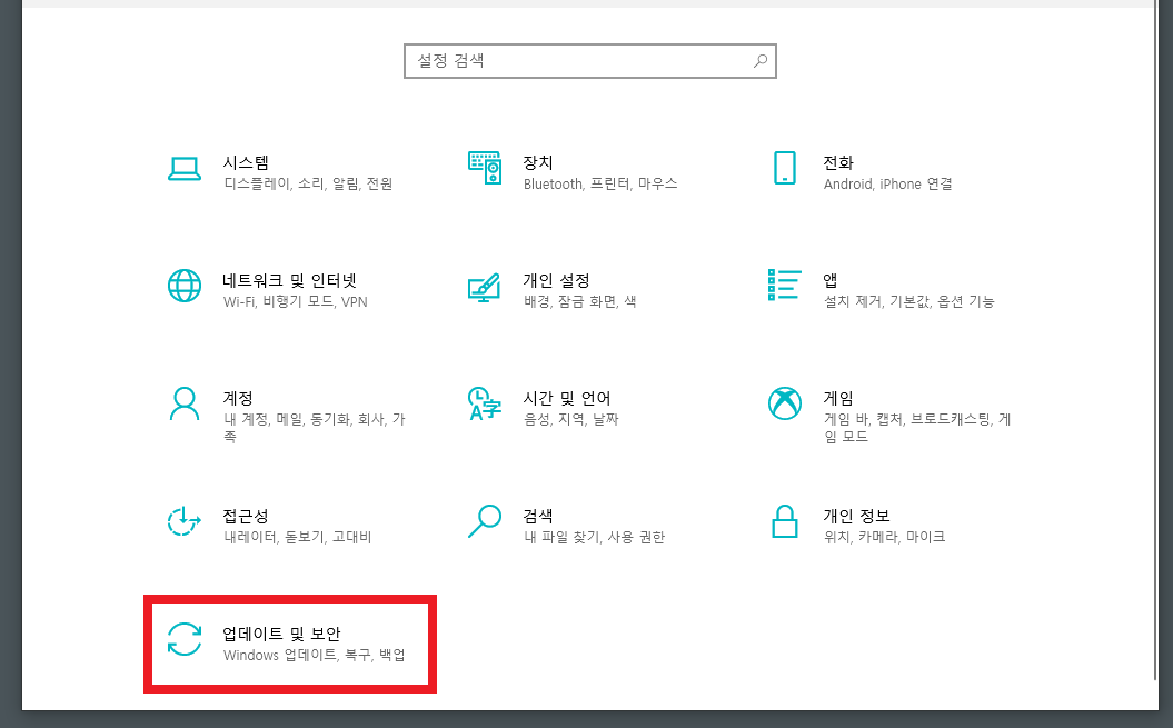 설정 메뉴가 뜹니다. 가장 아래쪽에 업데이트 및 보안 항목이 있습니다. 이 곳에서는 윈도우 업데이트와 복구, 백업이 가능하다고 나와 있습니다.