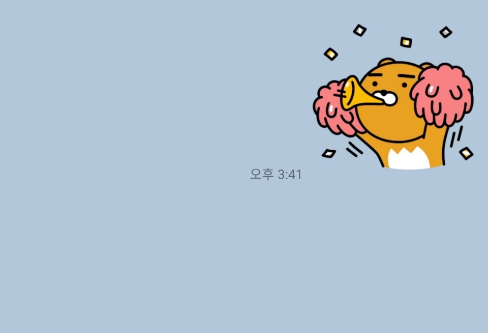 채팅방에서 카카오톡 이모티콘을 보내보았습니다. 나와 상대방에게 응원하는 라이언이 보여집니다. 힘내라는 응원 메시지 대신 이런 이모티콘을 보내봐도 좋겠습니다.