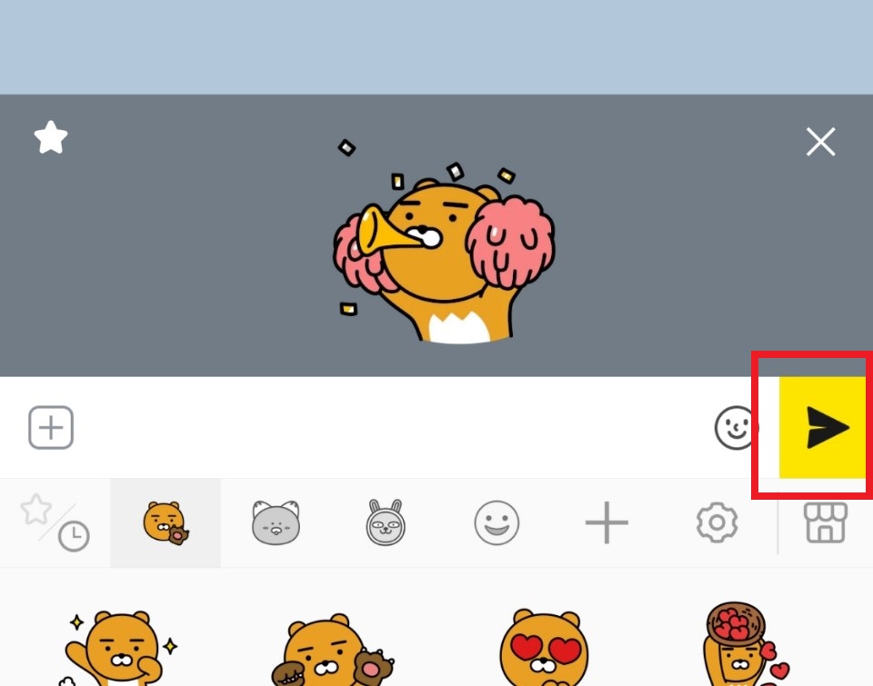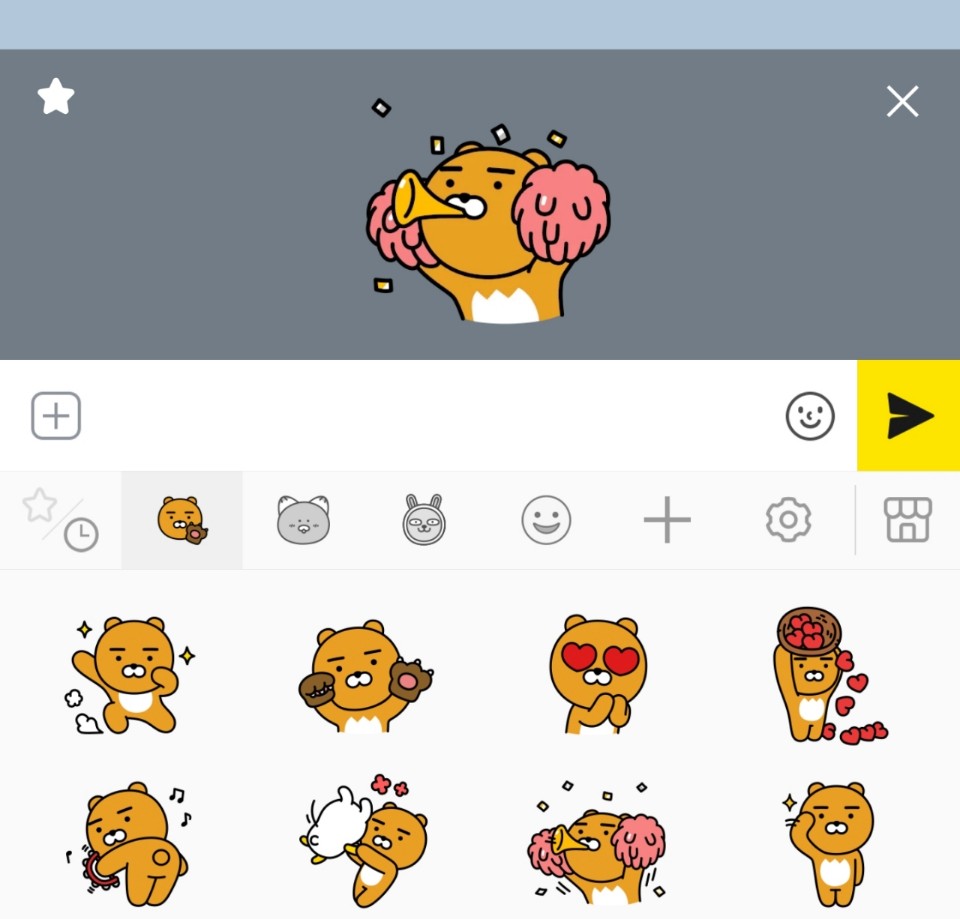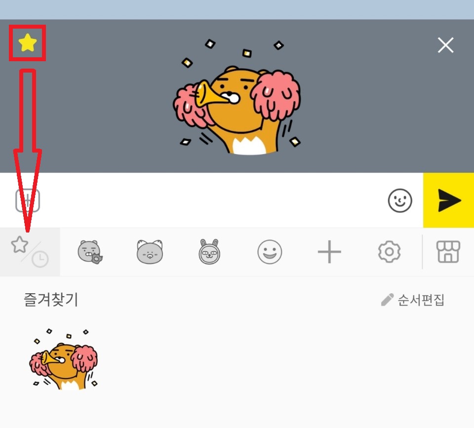 만약 내가 자주 사용할 예정이거나 좋아하는 캐릭터가 있다면 왼쪽 별 모양을 클릭하여 즐겨찾기를 하실 수도 있습니다. 즐겨찾기를 하면 추후 이모티코노 사용 시 가장 앞에서 해당 이모티콘을 바로 찾아 보내실 수 있습니다.