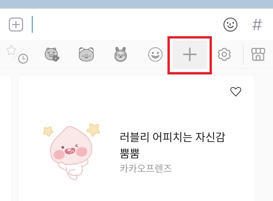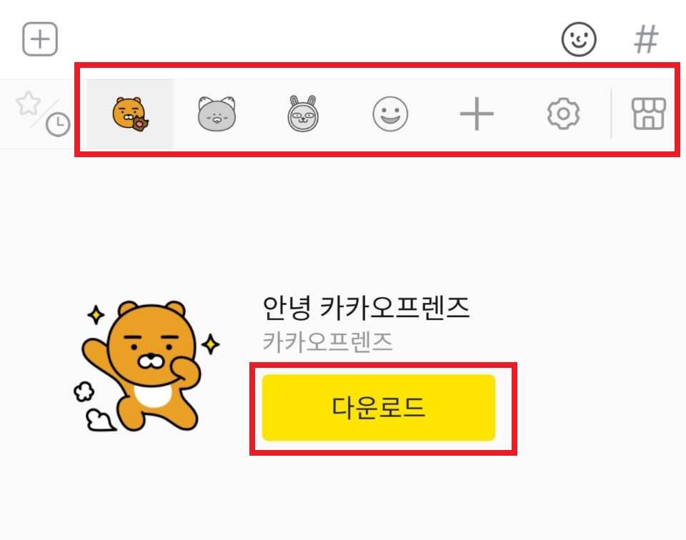이렇게 이모티콘 메뉴가 나옵니다. 한번도 이모티콘을 사용해본 적 없다면 먼저 카톡 이모티콘 다운로드가 필요합니다.