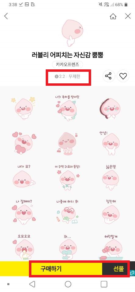해당 이모티콘이 무료인 경우에는 상단의 이모티콘명 아래 무료, 무제한이라고 나옵니다. 하지만 카톡 이모티콘 중 유료라면 위의 사진과 같이 $ 2.2 무제한 치라고 나옵니다. 여기서 $ 2.2가 해당 이모티콘 패키지의 가격입니다. 구매하기나 선물하기를 선택하실 수 있습니다. 보통 이모티콘 한 패키지당 2~3,000원 선이라고 보시면 됩니다.