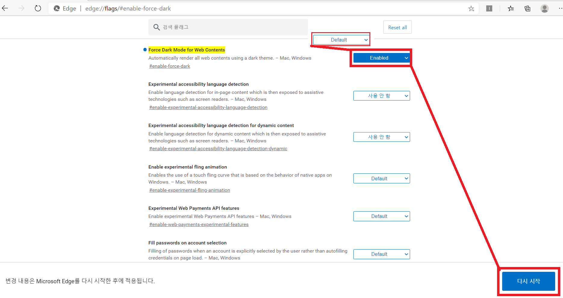 화면에 다양한 메뉴가 나타납니다. 그중 가장 위에 있는 Force Dark Mode for Web Contents 가 현재 Default 로 되어 있습니다. 이 부분을 선택한 후 Enabled 로 선택합니다.